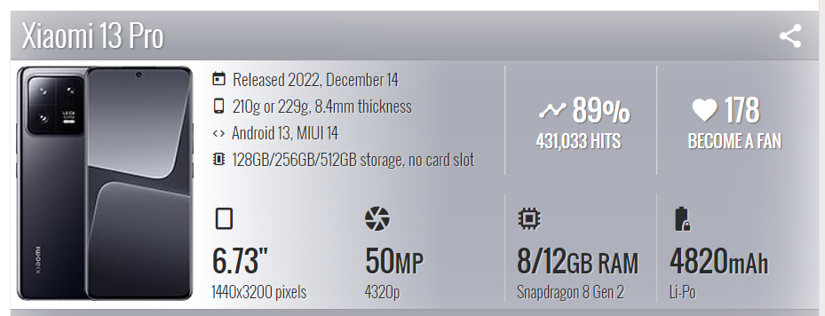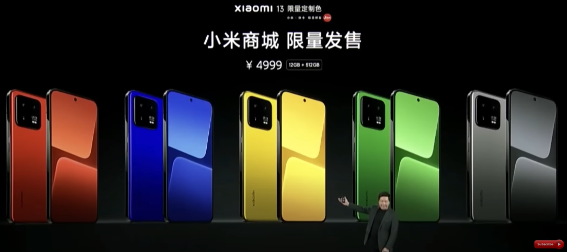 스냅드래곤 8 Gen2, LPDDR5X 메모리, UFS 4.0 스토리지, 4820mAh 배터리, 샤오미 Surge G1 전원 관리 칩, 120W 유선/50W 무선/10W 역 충전, 돌비 아트모스 스테레오 스피커, IR 블래스터, IP68 방진/방수. 트리플 5천만 화소 카메라, 소니 IMX989 1인치 센서는 f/1.9 조리개의 라이카 렌즈와 메인 카메라 구성, 3배 줌 라이카 플로팅 렌즈에 f/2.0 조리개와 초점 거리 10cm, 14mm f/2.2 초광각 AF. 샤오미 13 시리즈 발표. 라이카 카메라 탑재