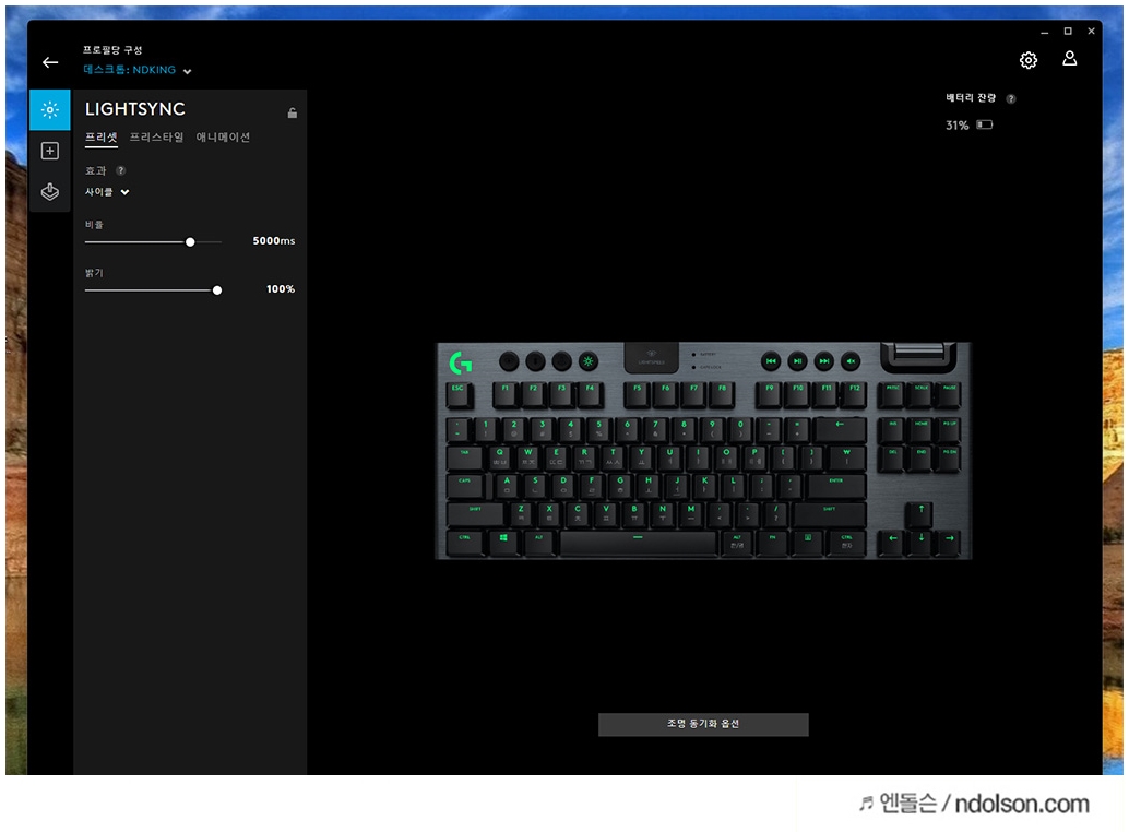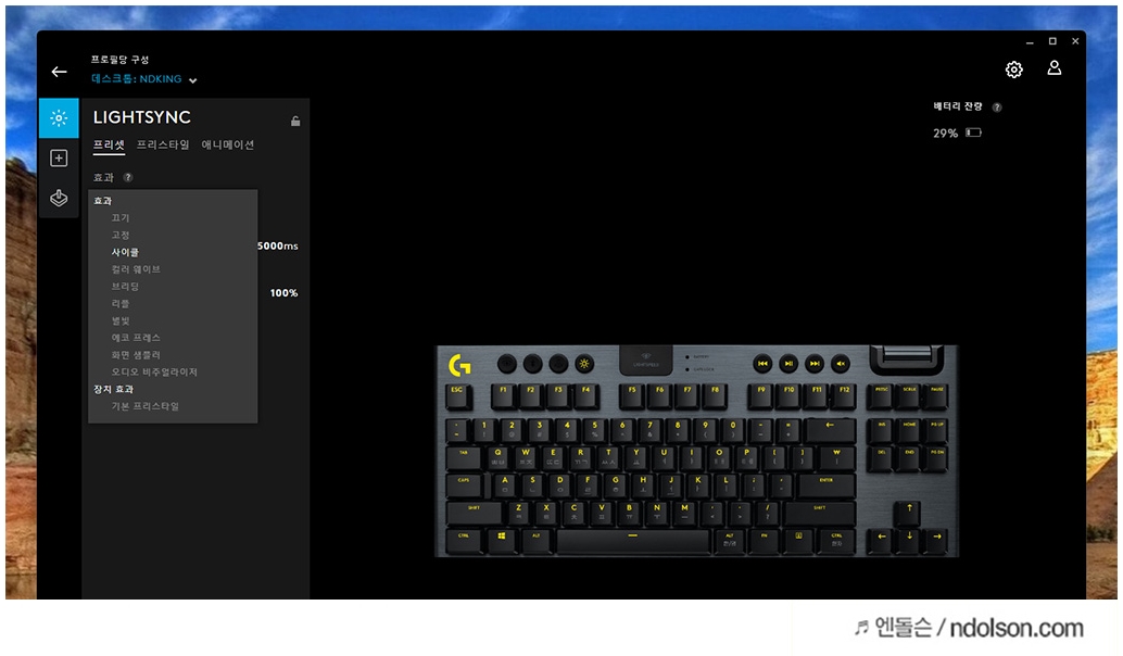 게이밍 기어의 장점은 나만의 RGB 컬러 조합에 있습니다. 로지텍 G913 TKL의 화려한 라이트닝 효과를 즐기기 위해 프리셋, 프리스타일, 애니메이션의 효과로 위해 고정, 사이클, 컬러 웨이브, 브리딩, 리플, 별빛, 에코 프레스, 화면 샘플러, 오디오 비주얼라이저 효과를 적용할 수 있습니다.