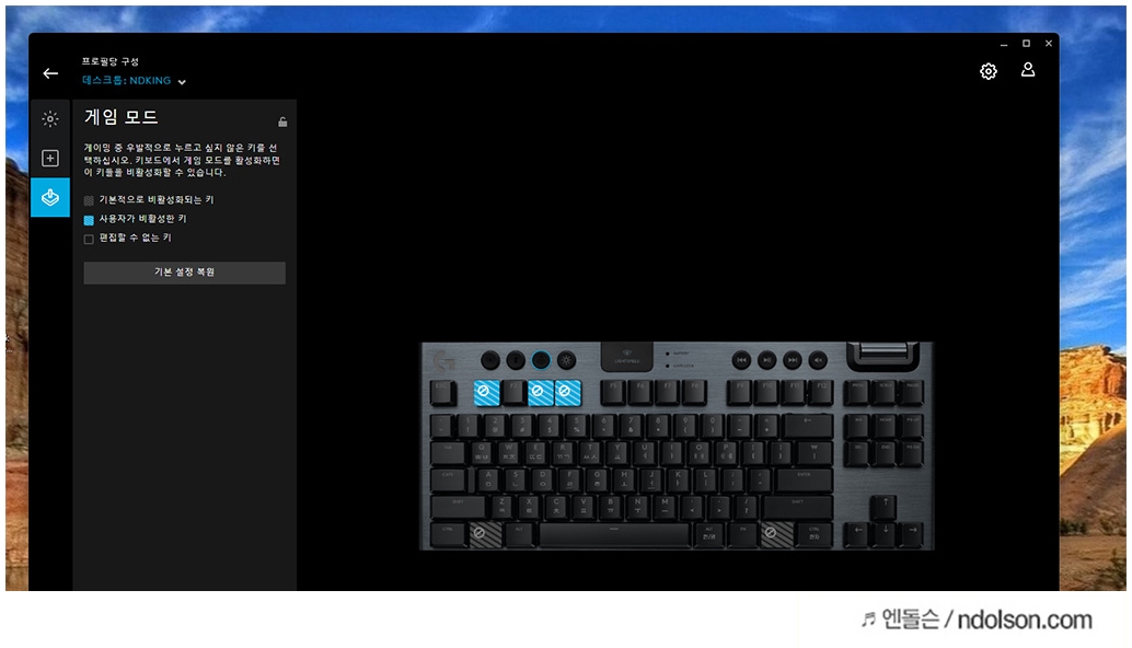 왼쪽 상단에 게임모드를 활성화하였을 때 키보드 키 동작을 비활성화를 지정할 수 있습니다. 이렇게 되면 게임할 때 실수로 윈도우키를 눌러 게임을 빠져나가거나 기능키를 눌러 특정 동작이 수행되지 않게 설정할 수 있어 요긴합니다.