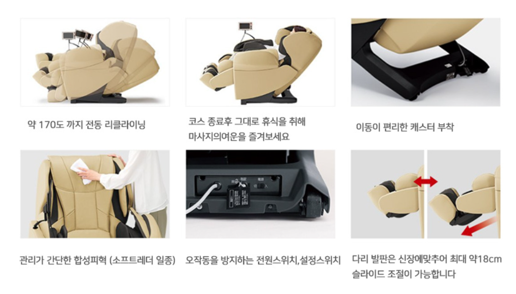 스트레칭 8종으로 증가, 마사지 시간 조정가능, 타이머 자동 OFF 시간이 길어짐, 타이머 후의 리클라이닝 유지가 가능해졌습니다.