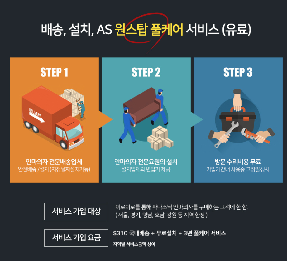 혹시나 풀케어 서비스를 이용하려면 현금 결제이며, 3년 풀케어 기간으로 늘어났습니다. 배송, 설치, AS까지 모두 처리해주니 걱정 없이 안마의자를 설치할 수 있습니다. 설치비는 5만원을 현장에서 지불하시면 됩니다.