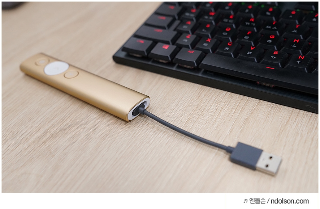 장시간 프리젠테이션으로 충전이 필요한 경우, 충전케이블로 충전이 가능한데 1분만 충전해도 3시간 동안 사용할 수 있어 급할 때 빠르게 충전해서 사용할 수 있습니다. 완전 충전까지는 1시간이 소요됩니다. 충전 상태는 진동 알람과 LED 표시등으로 확인할 수 있습니다. 완전 충전후에는 3개월까지 사용할 수 있어 배터리 부담은 없습니다.