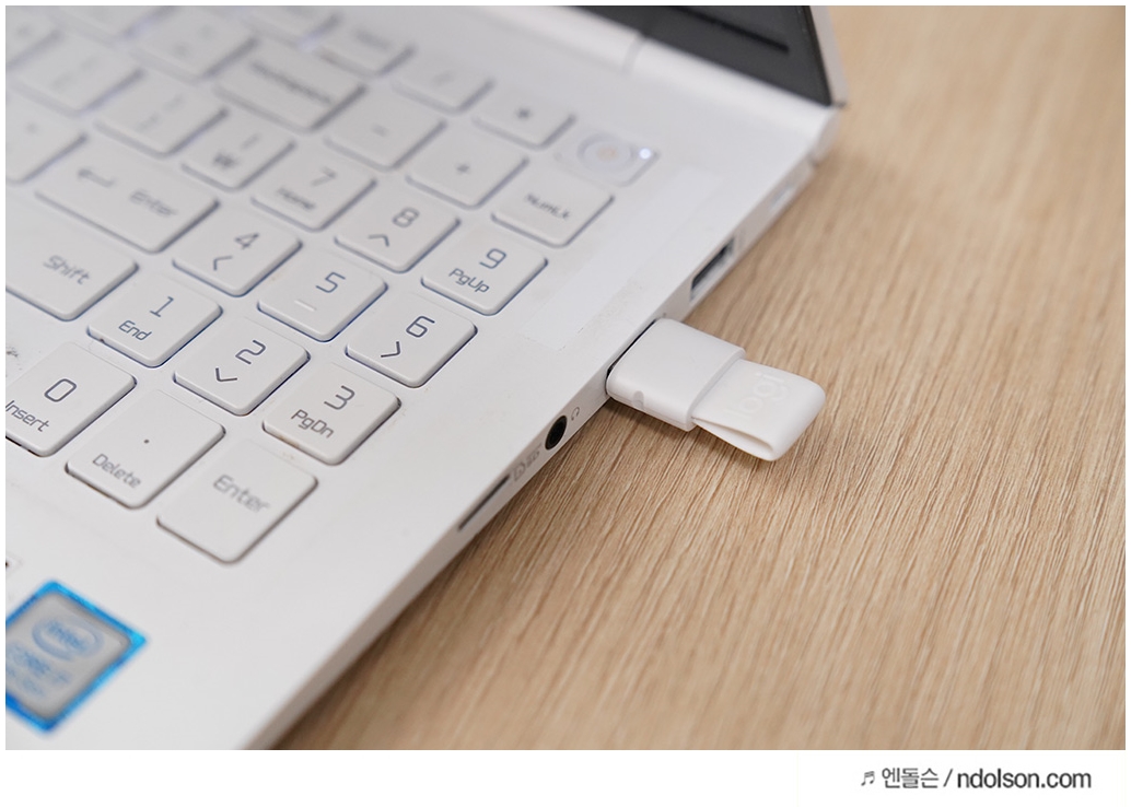 로지텍 스포트라이트의 하단에 USB수신기가 달려 있습니다. 잡아당기면 분리되는데 PC와 블루투스 연결 또는 USB수신기로 연결이 가능합니다.