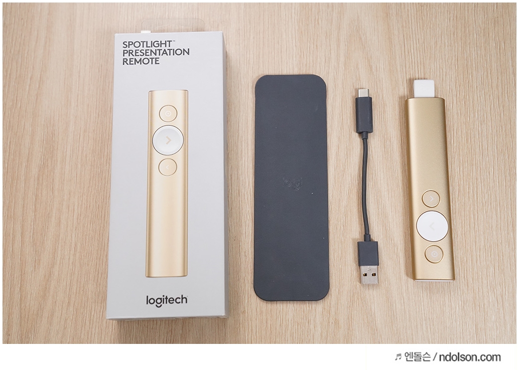 로지텍 스포트라이트의 구성품은 프리젠터 본체, 전용수신기, 파우치, 충전 케이블이 있습니다. 색상은 골드와 슬레이트 2가지로 선택할 수 있습니다.