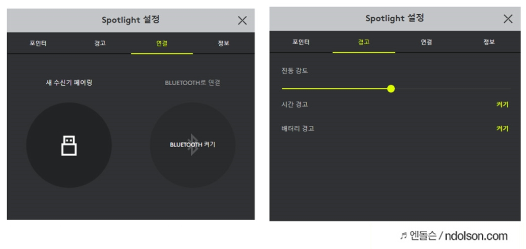 USB수신기 연결, 블루투스 연결 설정과 진동 강도, 시간/배터리 경고의 ON/OFF의 설정도 가능합니다.