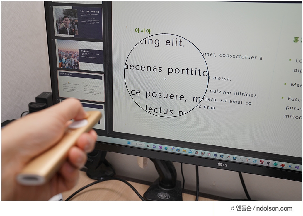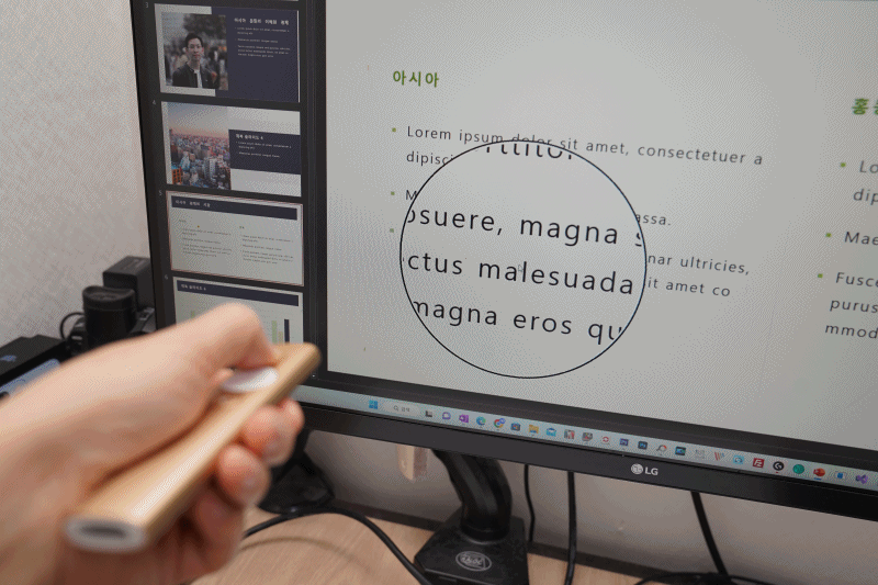 회사에서 OJT나 코드리뷰를 위해 자료를 모으고 PPT를 작성하여 프레젠테이션을 진행하기도 합니다. 충분히 발표준비를 하여도 듣는 수강생의 경우, 지루해 할 수 있습니다. 이럴 때 화면에 레이저 포인터를 쏘아주면서 강조해야 하는 부분에 돋보기로 보여주면서 더욱 관심을 유도할 수 있습니다.