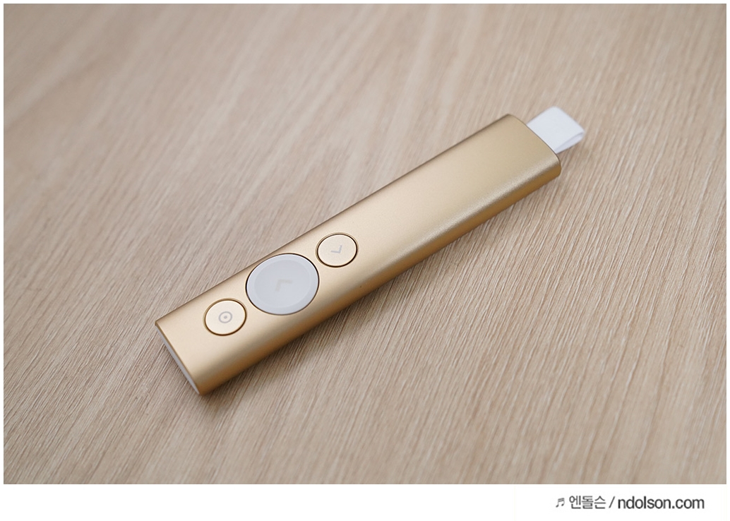 로지텍 스포트라이트는 직관적인 3버튼 인터페이스로 컨트롤이 쉽습니다. 상단에 포인터는 하이라이트, 확대, 레이저 포인트의 기능 버튼이고, 가장 큰 가운데 버튼은 재생/다음 페이지 이동 버튼입니다. 하단 버튼은 이전페이지로 이동할 수 있습니다.
