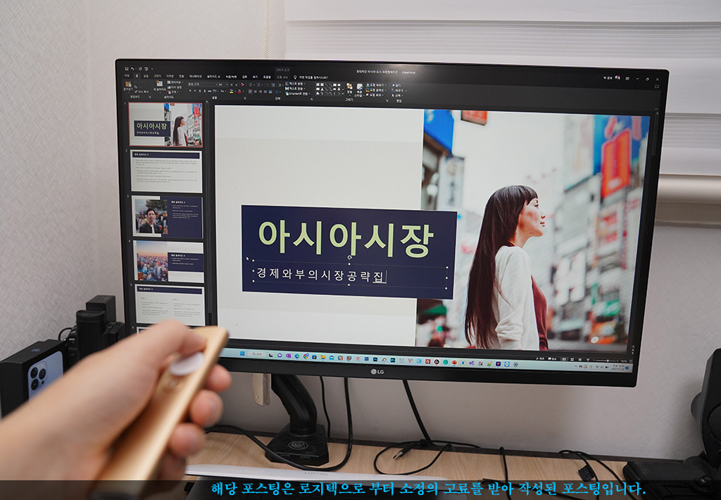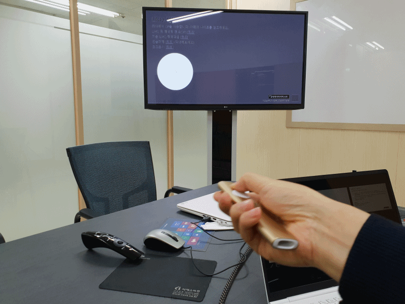 이럴 때 로지텍 스포트라이트를 사용하면 컴퓨터의 화면상의 커서를 제어해서 비디오 재생을 하거나 링크도 열 수 있습니다. 마우스를 사용하지 않고도 PC조작을 할 수 있어 발표할 때 편의성이 더 좋게 느껴졌습니다.