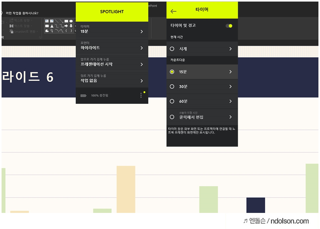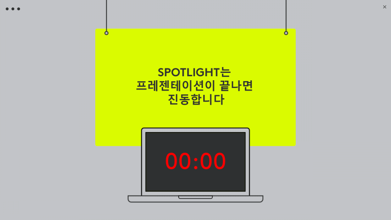 프레젠테이션을 위해 타이머 기능을 지원해 시간관리를 하면서 발표를 진행할 수 있습니다. 정해진 시간만큼 타이머를 설정해 두어 알람을 받으면 발표를 마무리할 수 있는 시간관리가 가능하니 좋습니다.