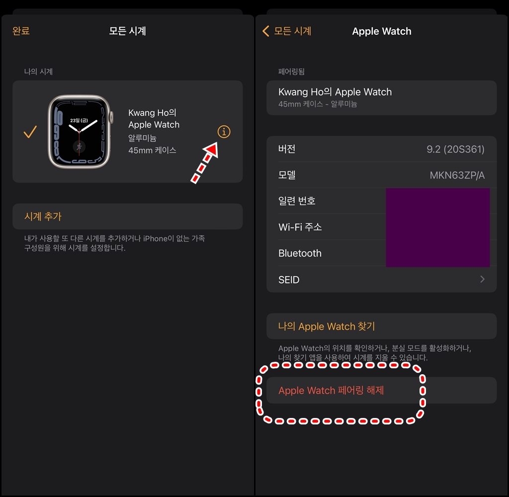 애플워치의 정보를 눌러 Apple Watch 페어링 해제를 눌러 줍니다.