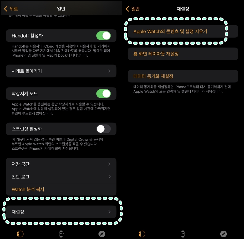 또는 애플워치 설정에서 일반 > (맨하단) 재설정을 눌러줍니다.