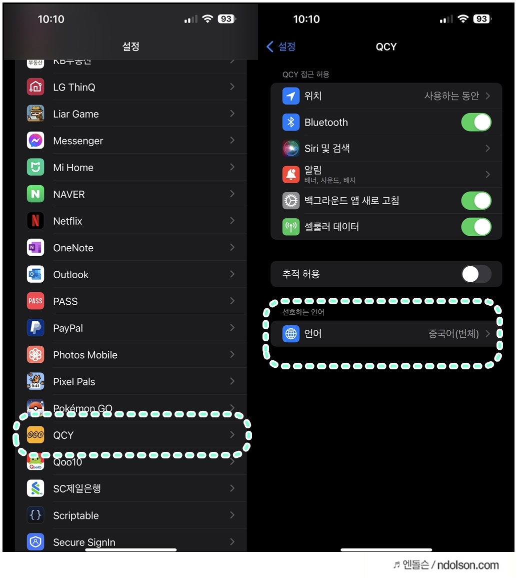 아이폰에서 설정 > QCY 앱 설정을 찾습니다. 언어를 중국어로 설정합니다.