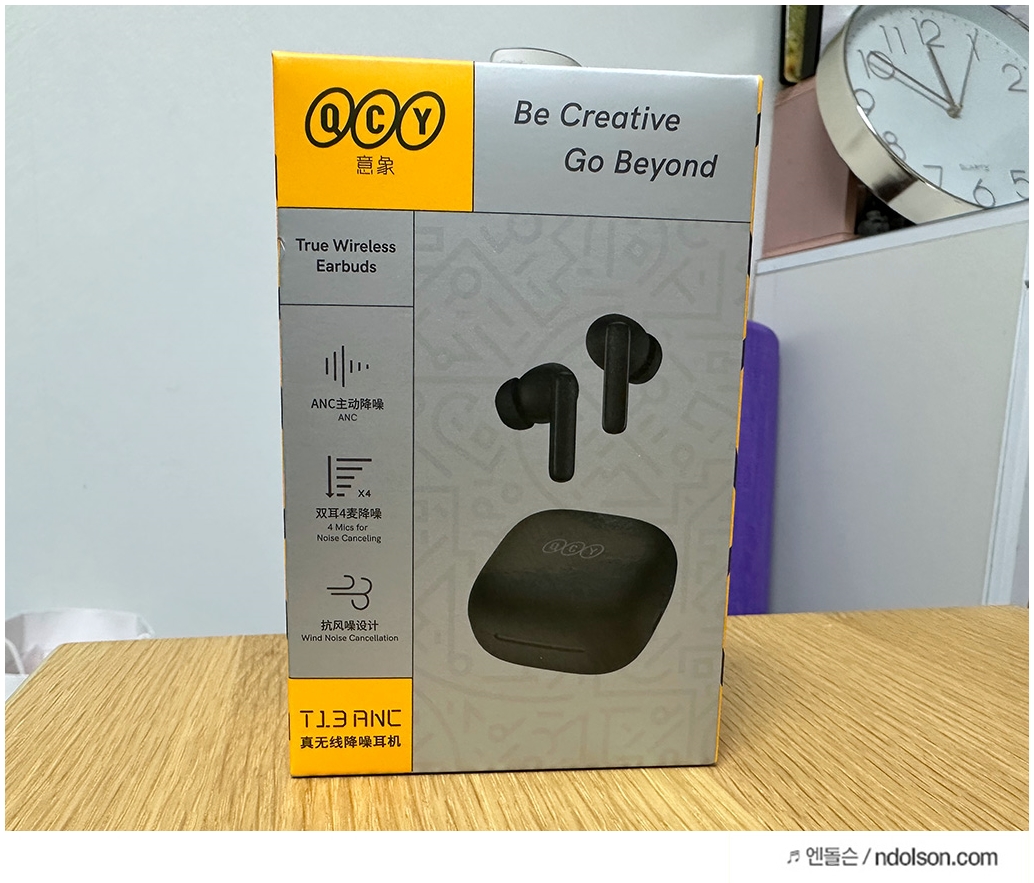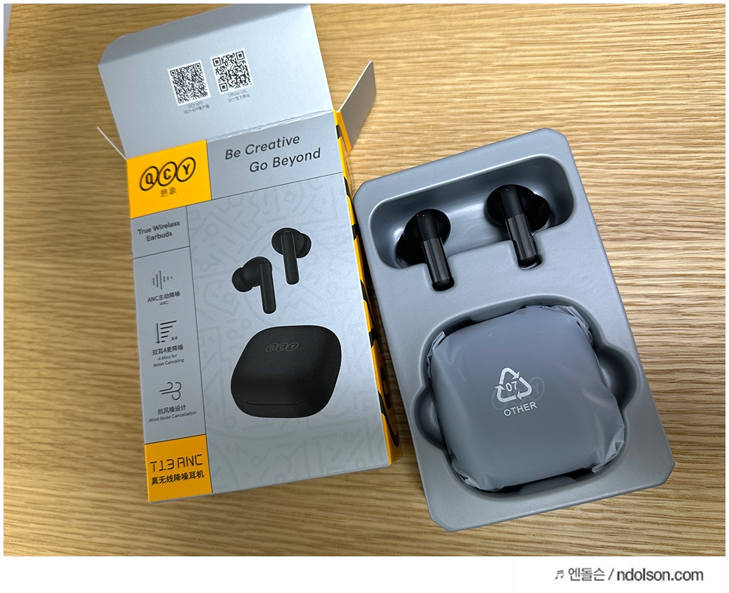 QCY T13 ANC 이어폰의 개봉기입니다. 박스패키지에는 QCY 가성비 이어폰의 성공을 자랑하듯(?) 노란색 배경에 도배가 되어 있습니다.