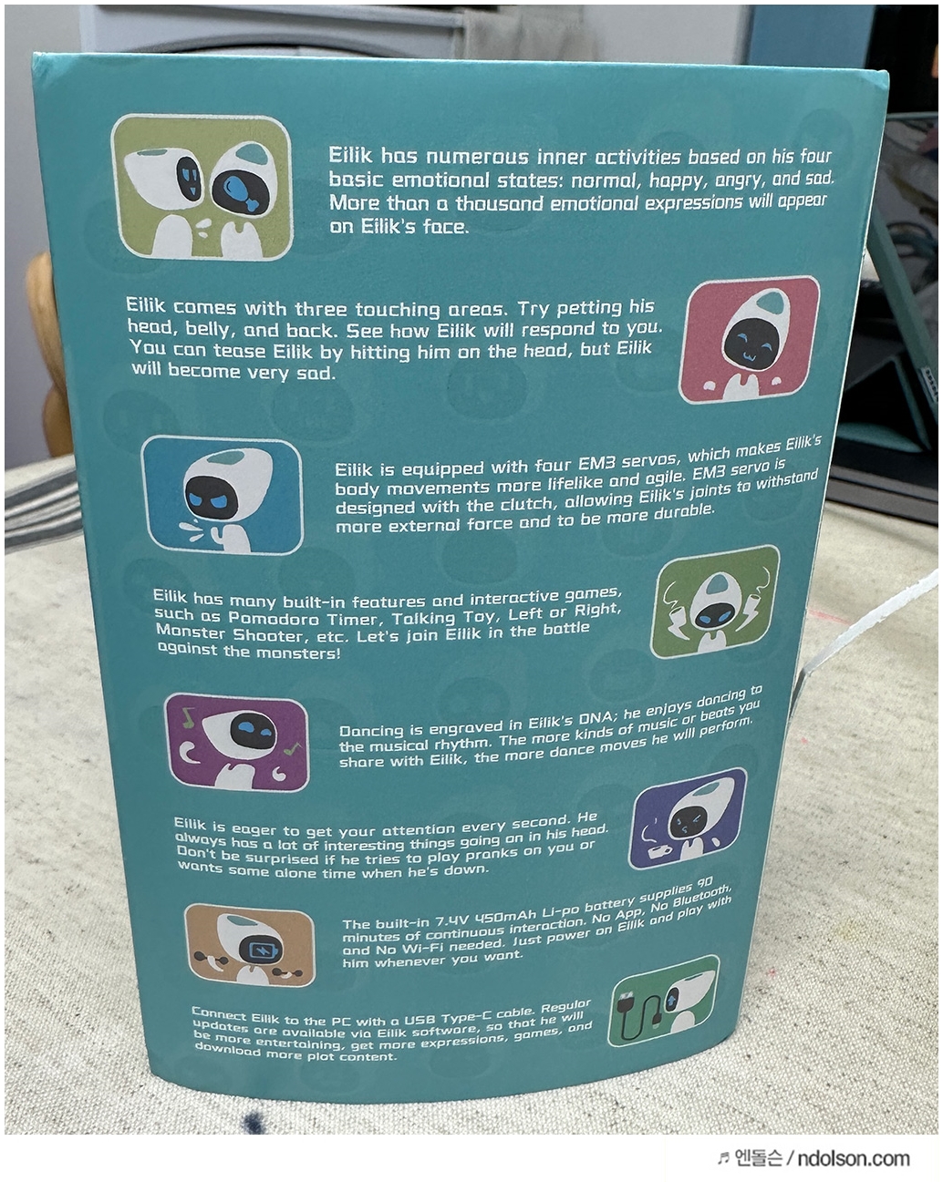 책상위에 두고 괴롭히기 좋은 에일릭 로봇은 다리가 없어 걷지 못합니다. 하지만 각 부분 센서가 동작해서 머리와 등, 배를 만지면 동작합니다. 또 책상을 세게 치거나 머리를 때리면 울어 버립니다. 삐지기도 일쑤입니다.