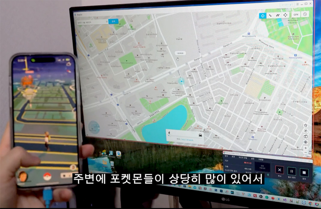 아이폰에 포켓몬고 게임을 하고 있는데, AnyGo 프로그램을 통해 원하는 GPS 위치를 클릭하고 "가다(Go)"를 누르면 이동합니다. 걷게 할 수도 있고 속도 조절도 가능합니다.