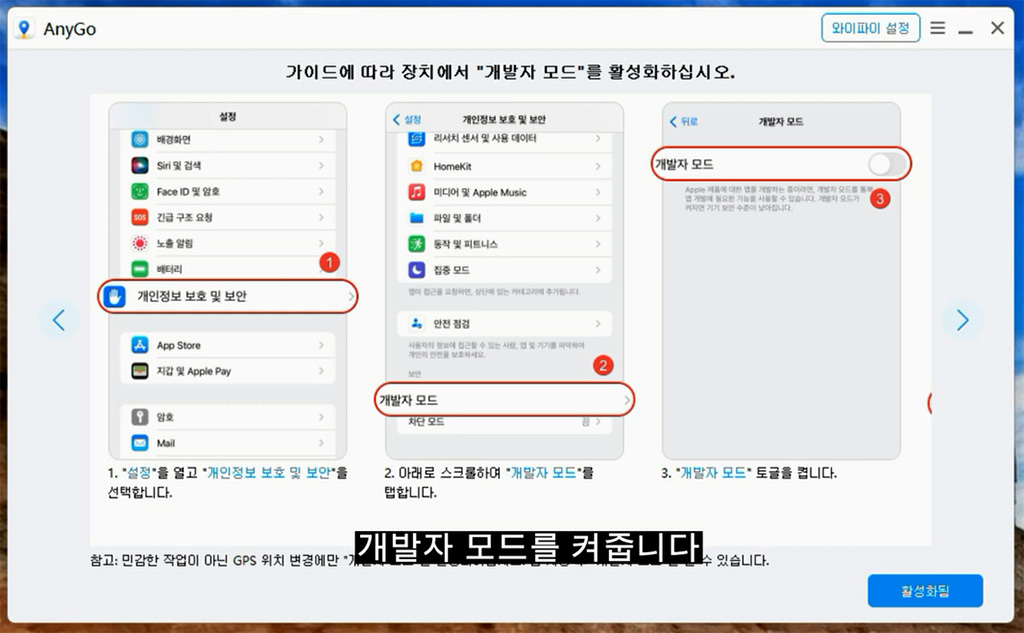 프로그램의 가이드대로 아이폰을 개발자 모드로 수행하여 줍니다.