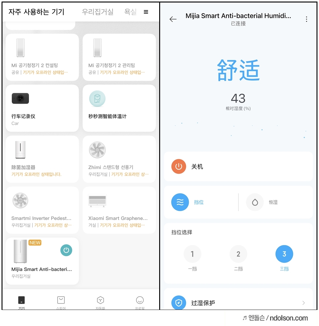 샤오미 가습기 2세대 등의 경우 미홈앱에 중국어로 나옵니다.