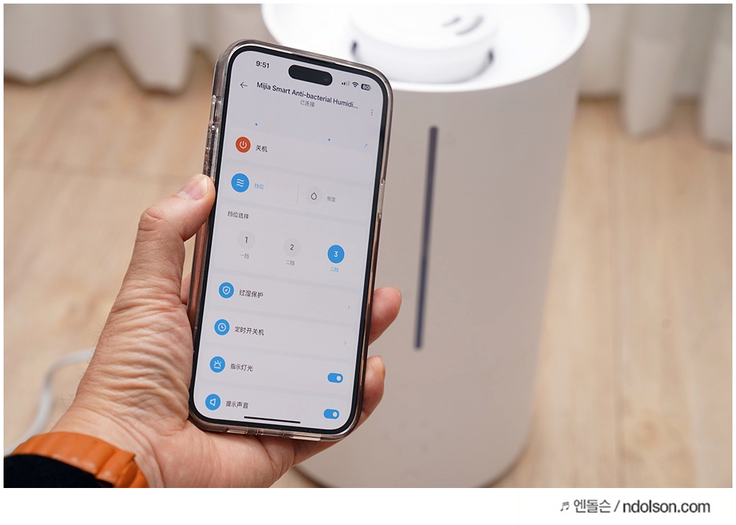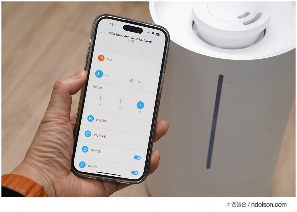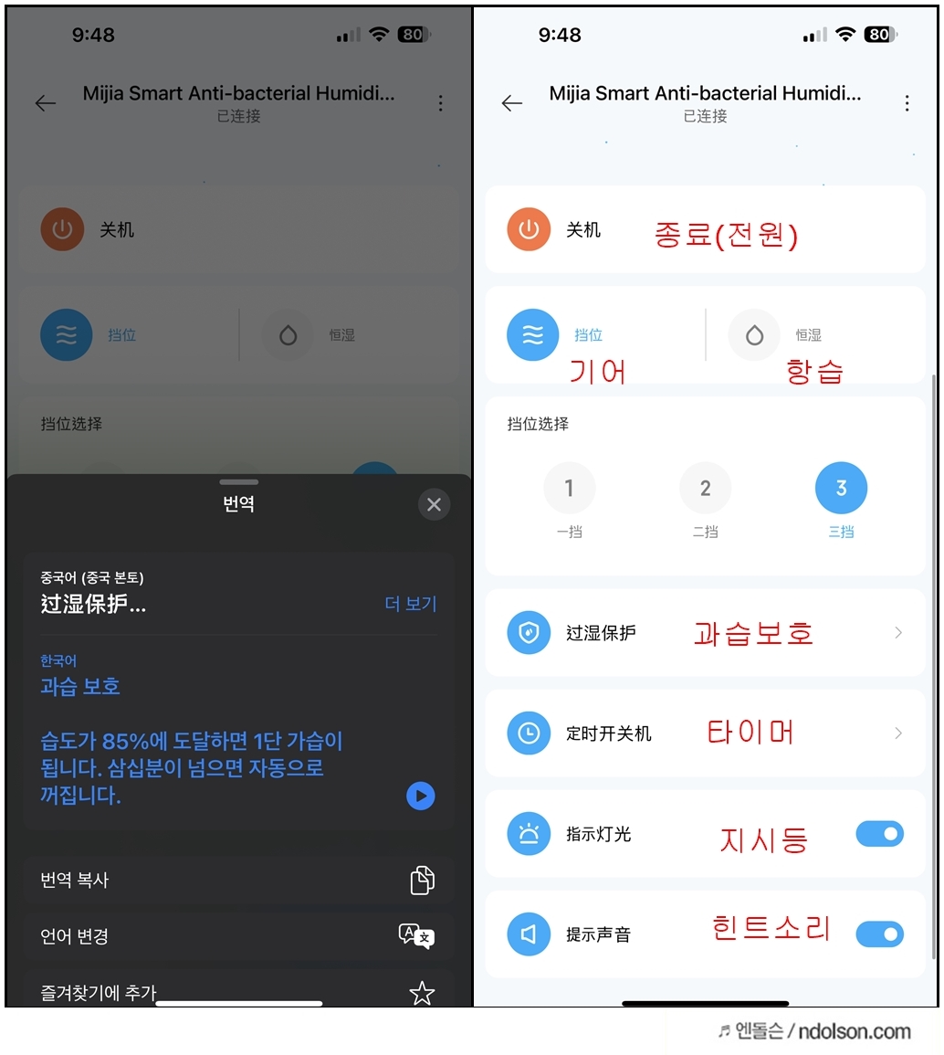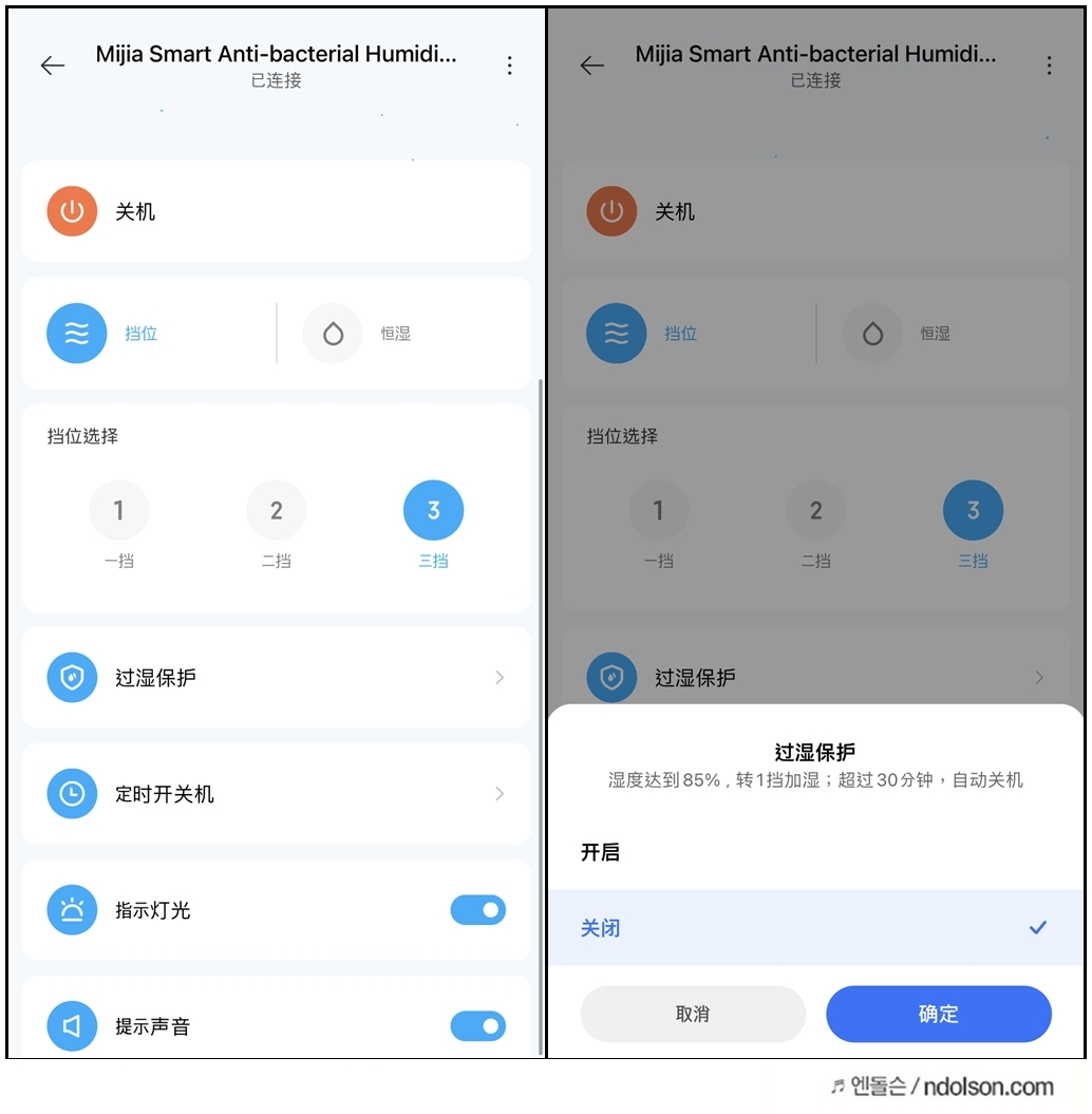 湿度达到85%,转1挡加湿;超过 30分钟,自动关机 : 습도 85%에 도달하면 1단 기어를 돌려 가습하고, 30분 이상 경과하면 자동 꺼짐