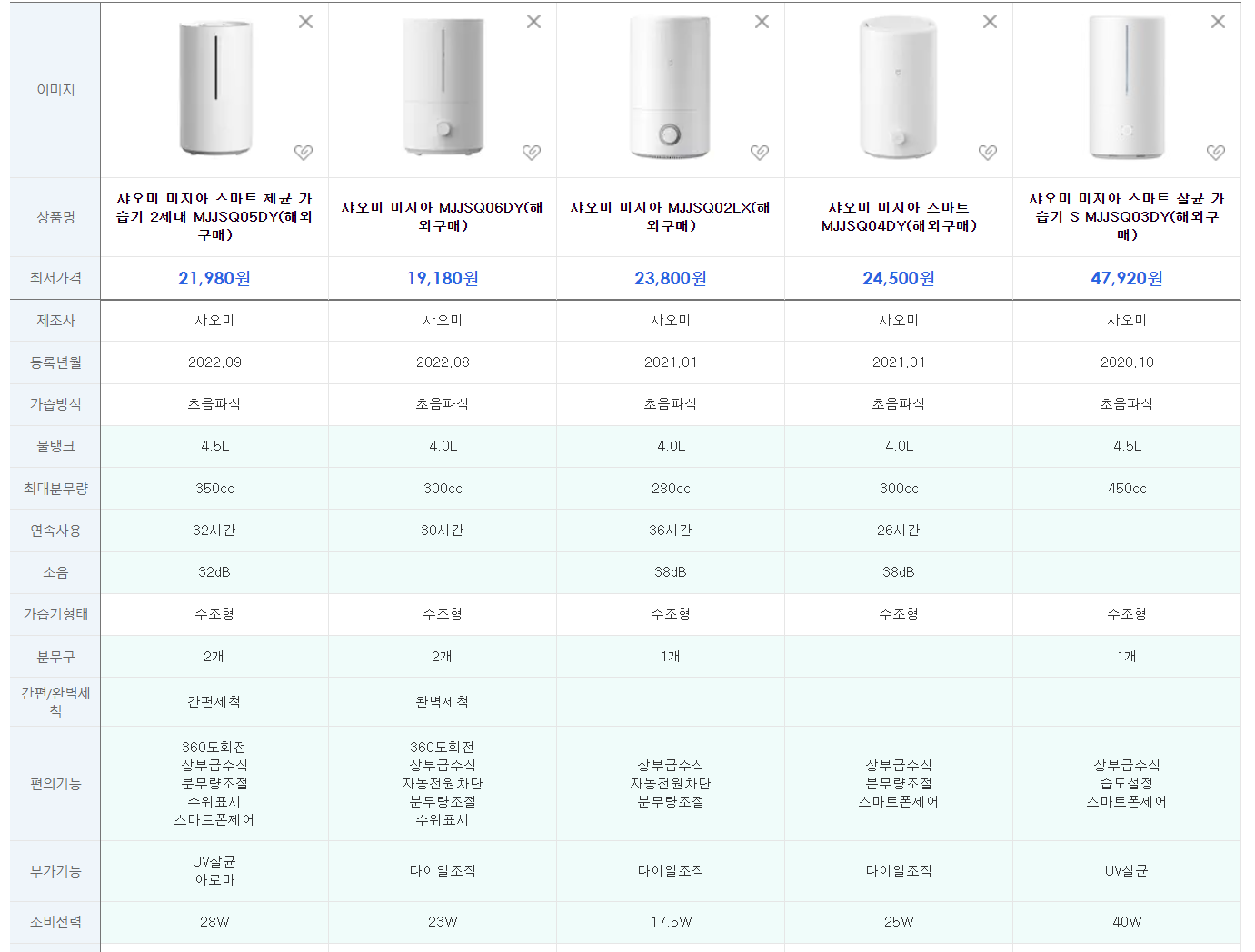 다시 한번 년도별로 MJJSQ05DY, MJJSQ06DY, MJJSQ02LX, MJJSQ04DY, MJJSQ03DY 샤오미 가습기 모델별 비교를 해보았습니다.