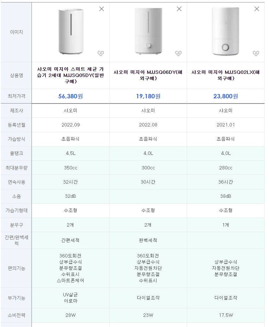 샤오미 미지아 가습기 스펙 비교