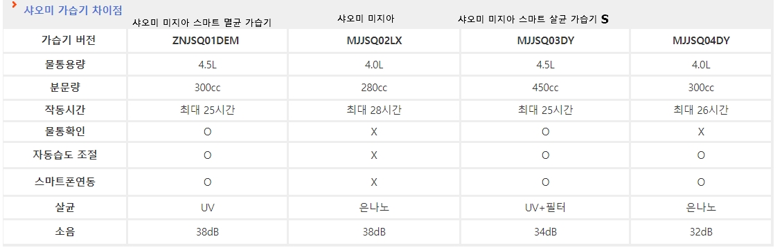 샤오미 미지아 가습기 족보 비교입니다.