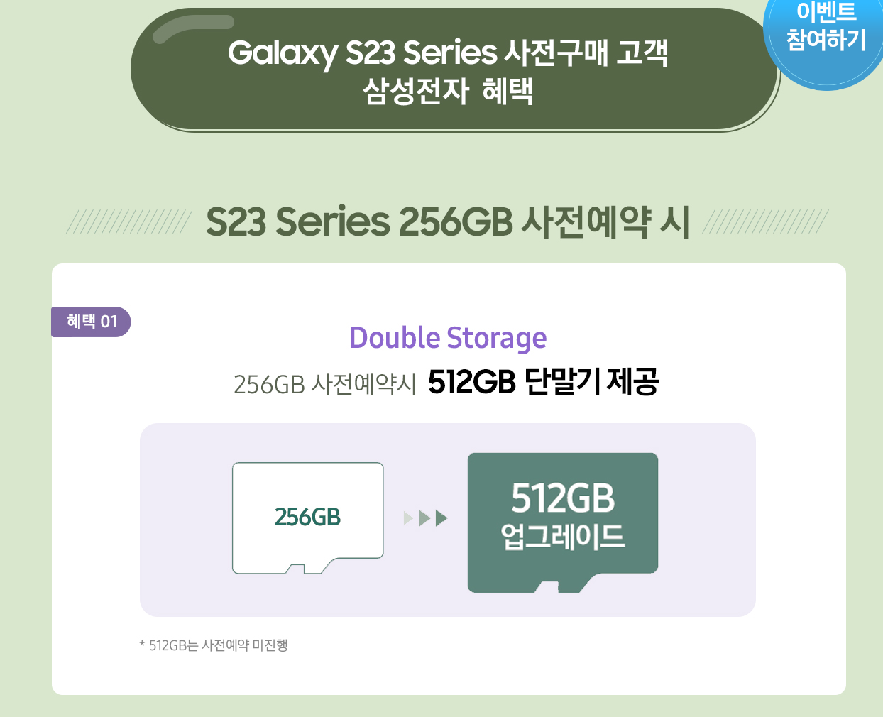 혜택1. Galaxy S23 시리즈 256G 사전 예약 시 256G -> 512G 업그레이드