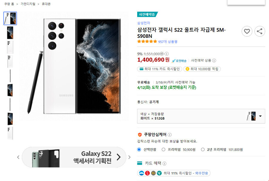 갤럭시S22 사전예약 시 13% 카드 할인혜택과 삼성케어 플러스 1년, 제품 할인권 10만원 또는 15만원 혜택을 주었습니다.