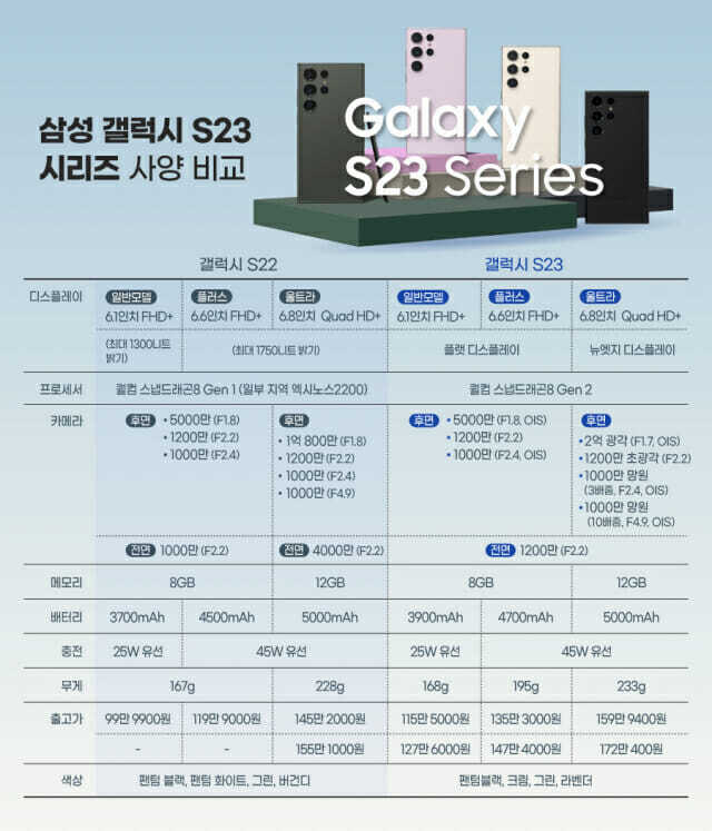 갤럭시 S23 시리즈와 S22 전작과 비교하면 차별화를 볼 수 있습니다.가격은 15만원정도 인상이 되었지만, 개선사항이 많은 만큼 기대가 됩니다.