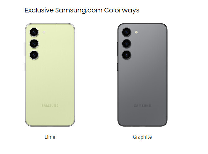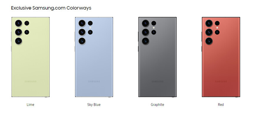 특별한 색상을 원한다면 갤럭시S23 삼성닷컴에서 골라볼 수 있습니다. 온라인으로만 구매가능한 모델입니다. 삼성닷컴 단독 컬러로는 그라파이트, 스카이블루, 레드, 라임 4가지 색상으로 골라볼 수 있습니다. 갤럭시S23과 갤럭시S23 플러스는 그라파이트, 라임 색상 2종입니다.