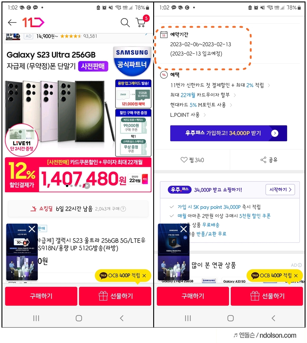 갤럭시 S23 11번가 사전예약의 라이브방송에서는 전에 일본가서 우연히 만나보았던 서울리안 유튜버가 하시더군요~ 반갑구! 좋았는데 응모만해도 되는 라이브 방송 이벤트가 많았지만, 쿠팡과 11번가 둘다 구매했다가 결국 쿠팡으로 했습니다. 가장 혜택이 쿠팡이 없지만 혹시나 조금 더 빨리 올까(?) 하는 조바심일뿐 혜택은 없습니다.
