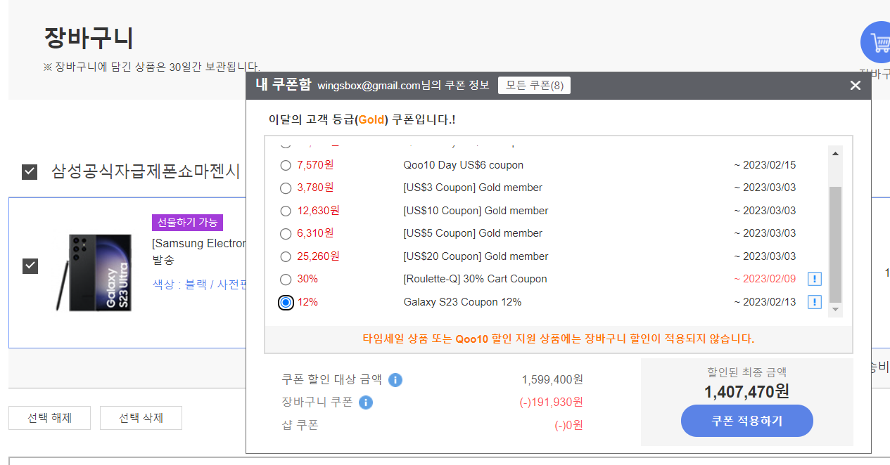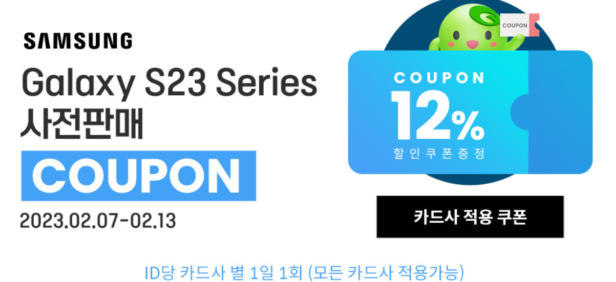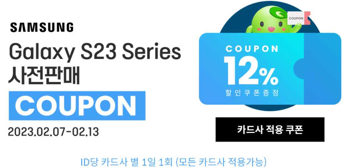 위의 링크에서 12% 할인 쿠폰을 받고 구매하시면 갤럭시 S23 할인이 됩니다.