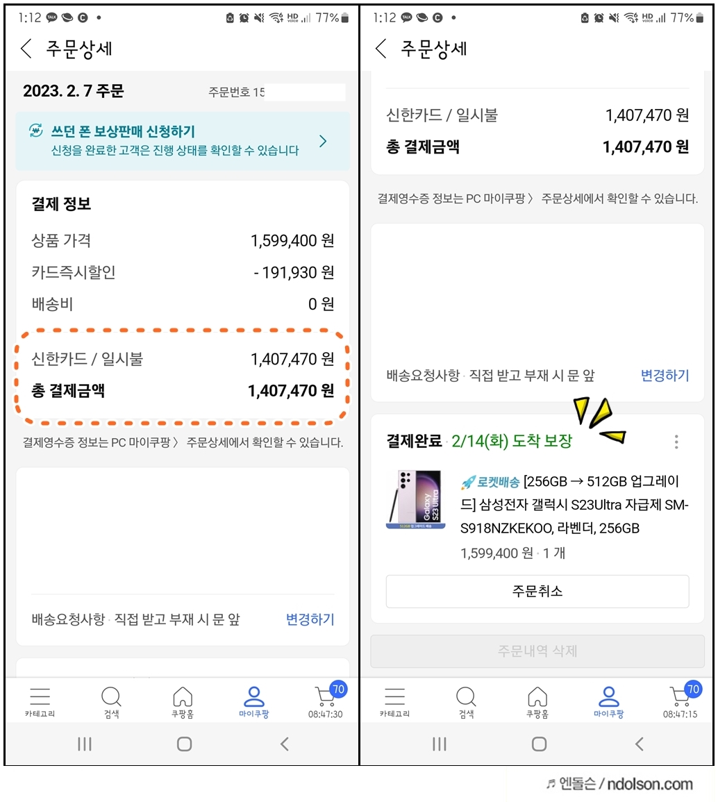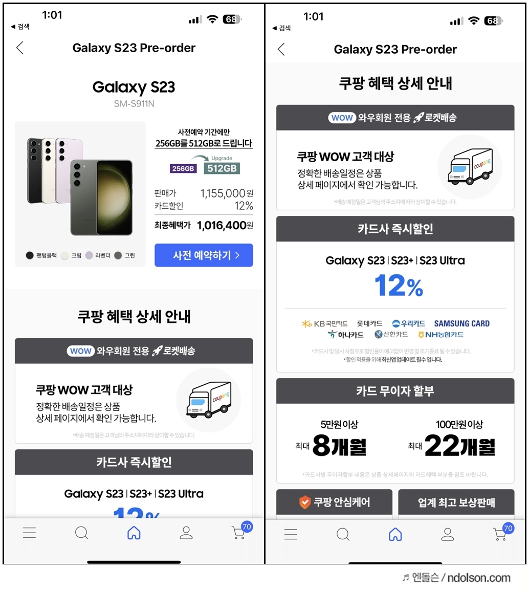 S23 가격 놓고 보면 엄청난데, 사전예약으로 카드할인 12% 할인을 해주는 것과 256GB를 사도 512GB로 업그레이드해주는 이점 때문에 구매하게 되었습니다. 하지만 이번에 라이브 방송 혜택 빼고는 특별한 혜택이 없어 아쉬웠습니다. 또 쿠팡으로 어렵게 구매했지만, 13일 입고 14일 배송으로 와우회원 로켓배송도 의미가 없네요. 약간이라도 빠른 배송을 믿어 보겠습니다.