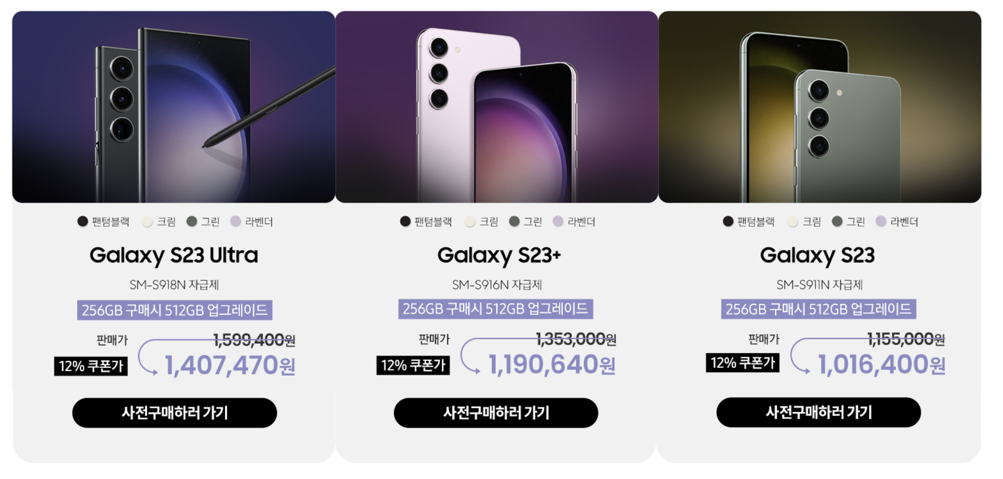갤럭시 S23 시리즈가 전자보다 15만원가량 올라 갤럭시S23 256GB는 115만 5000원, 512GB가 127만 6000원이며 S23 플러스가 256GB는 135만 3000원, 512GB가 147만 4000원이고, S23 울트라 256GB는 159만 9400원, 512GB가 172만 400원입니다.