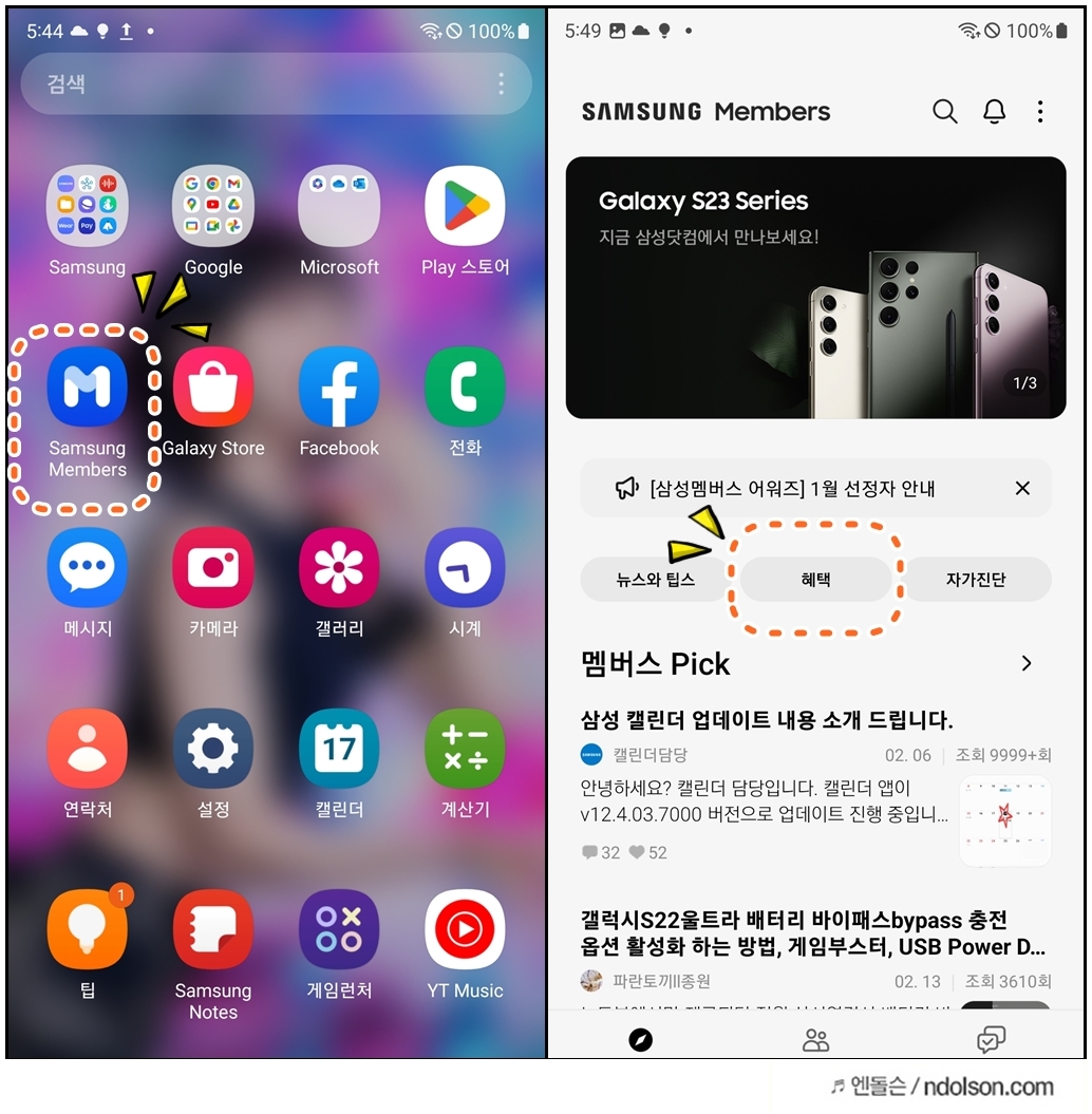 구매한 갤럭시 S23 스마트폰에서 삼성 멤버스 앱을 실행합니다.