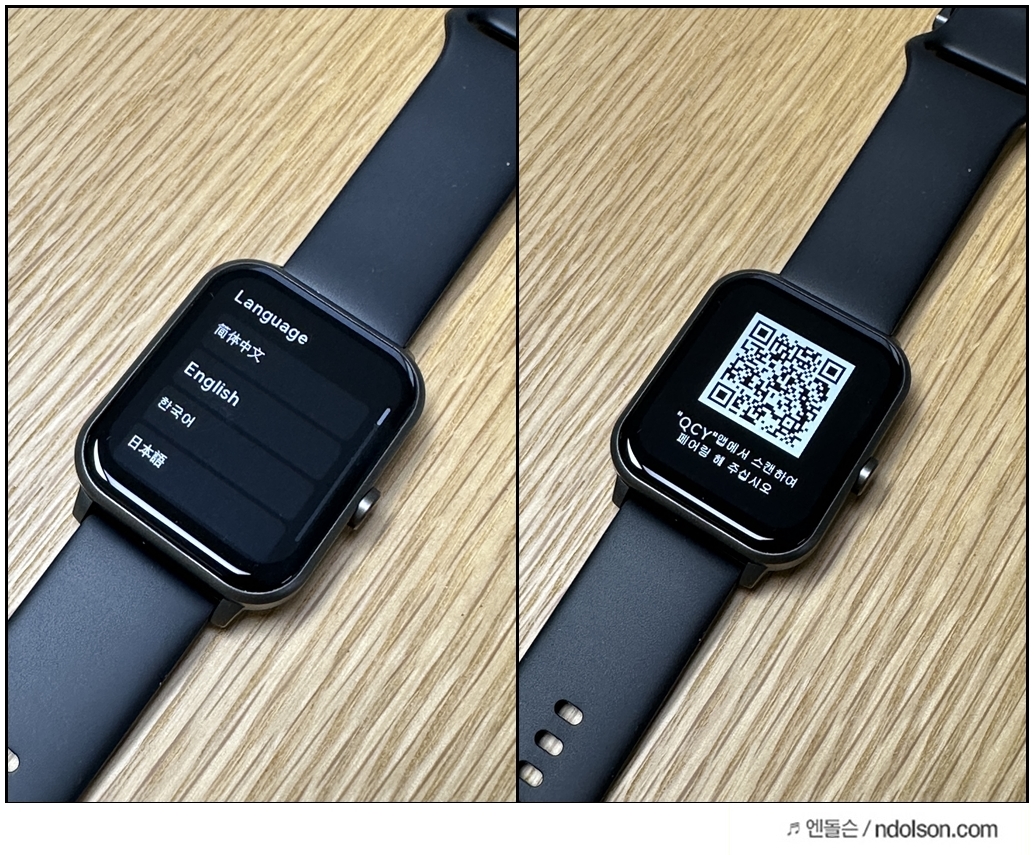 처음 QCY 스마트워치 GTS 2세대를 켜면 Hello로 반겨줍니다. 이후 QCY 앱을 통해서 QCY 스마트워치 GTS 2세대의 QR코드 또는 주변장치 찾기로 등록하면 됩니다.