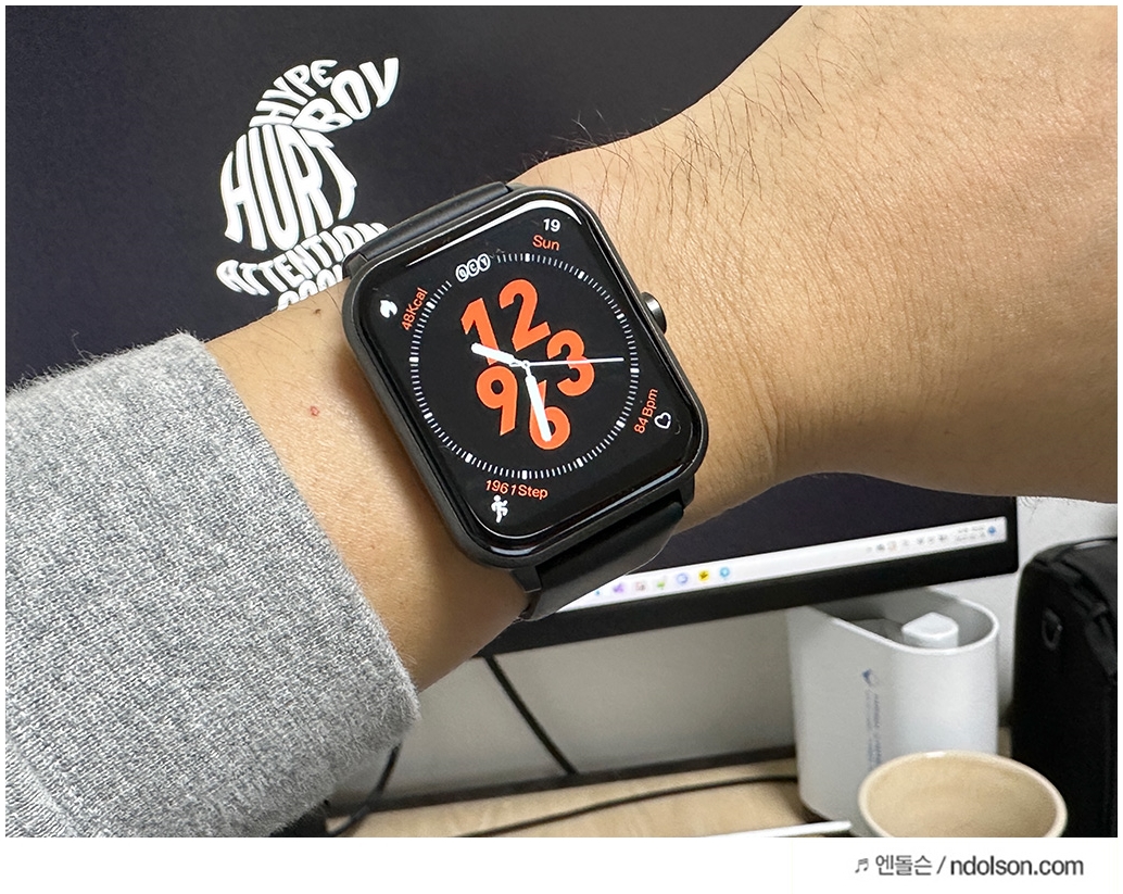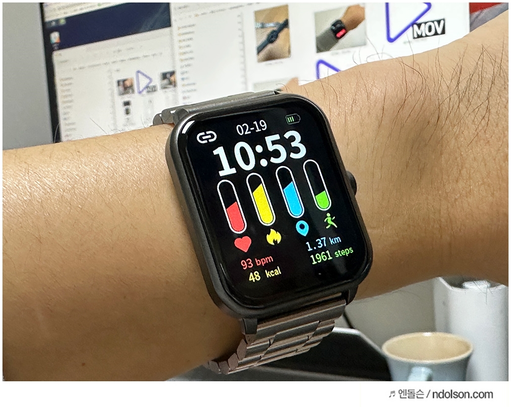 전체적인 QCY GTS 2세대 스마트워치는 각진 외형에 추가로 구매한 메탈 스트랩으로 조금 더 스타일이 멋지게 즐길 수 있었습니다. 하지만 애플워치랑 비교하면 용두는 휠이 아닌 버튼이며 플라스틱 재질로 가까이에서 보면 싼티가 조금 났습니다.