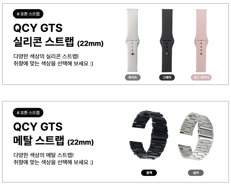QCY 제품이지만, 이전에 구매한 어메이즈핏 GTS 4 미니 등의 스트랩과도 호환이 가능한 제품으로 시계줄 꾸미는 재미가 있습니다.