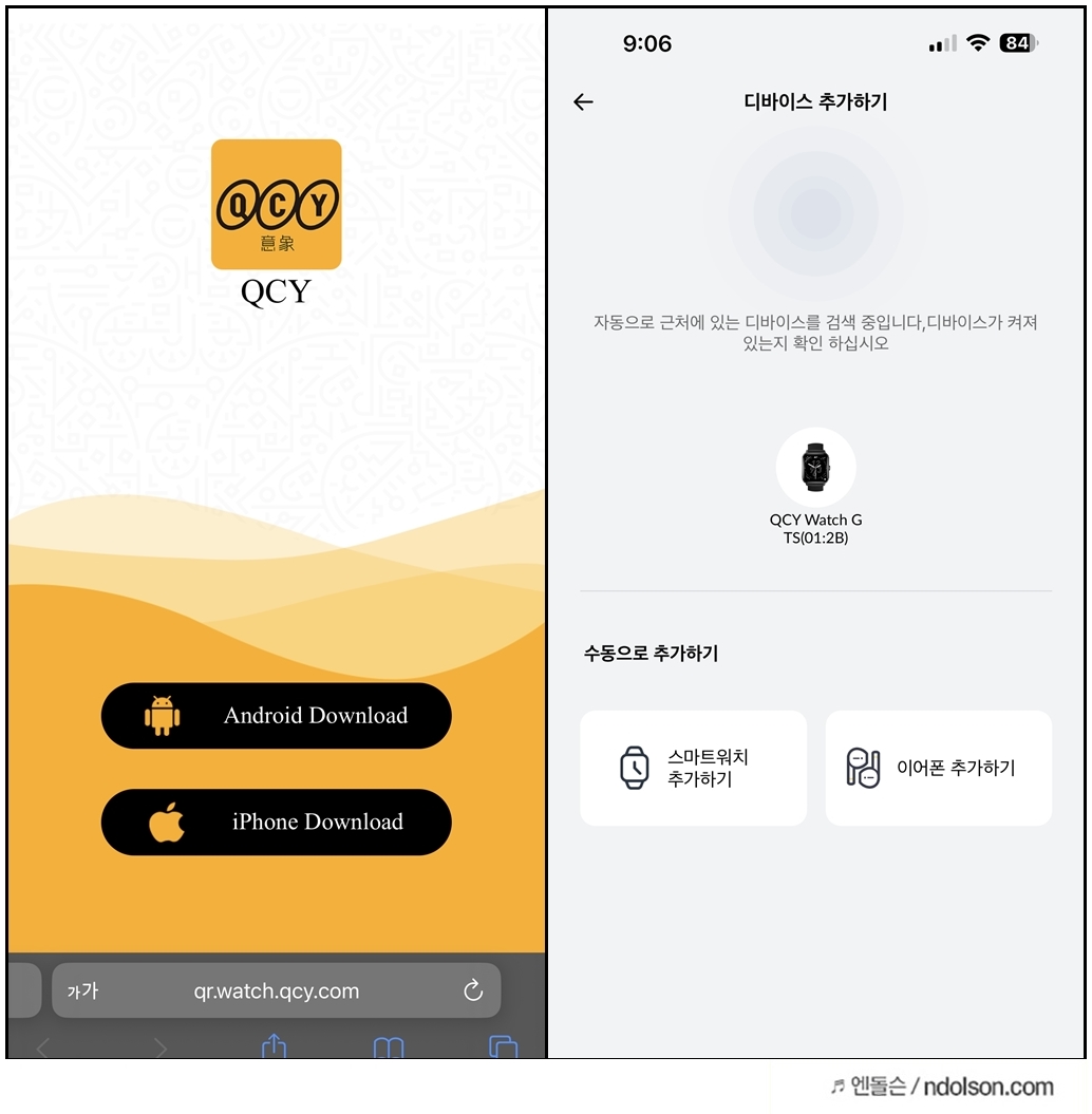 QCY 스마트워치 GTS 2세대의 화면에 표시된 QR코드를 연결하면 iOS, 안드로이드 연동 QCY 앱의 다운로드 페이지가 나옵니다. 설치하고 QCY 스마트워치 GTS 2세대를 블루투스 페어링으로 연결하였습니다.