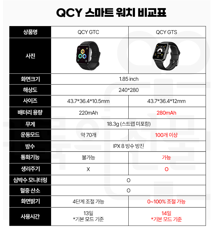 어쩌다가 QCY GTC와 GTS 2세대를 구분하지 못하고 둘 다 구매해 보았습니다. QCY 스마트워치 2세대인 GTS가 가격은 조금 더 비싸지만, 배터리와 블루투스 전화통화까지 가능해서 가성비가 훨씬 좋았습니다.