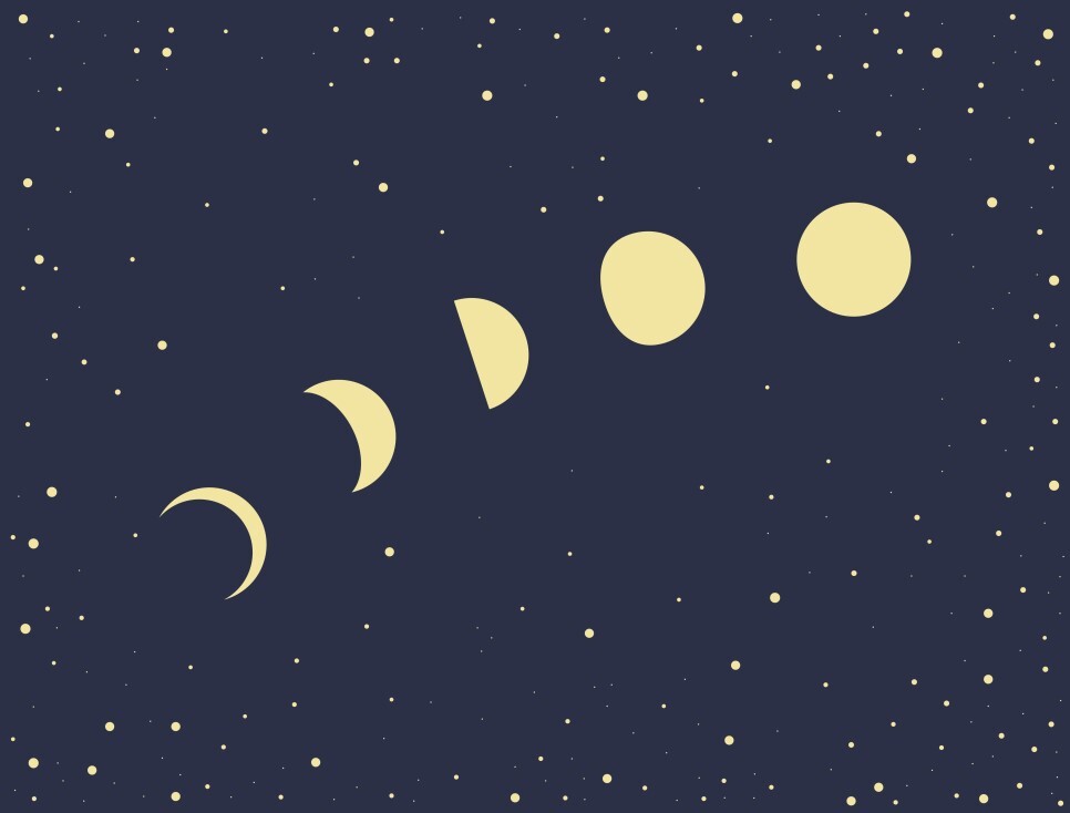 초승달(음력 3일) → 상현달(음력 7~8일) → 보름달(음력 15일) → 하현달(음력 22~23일) → 그믐달(음력 26~27일)