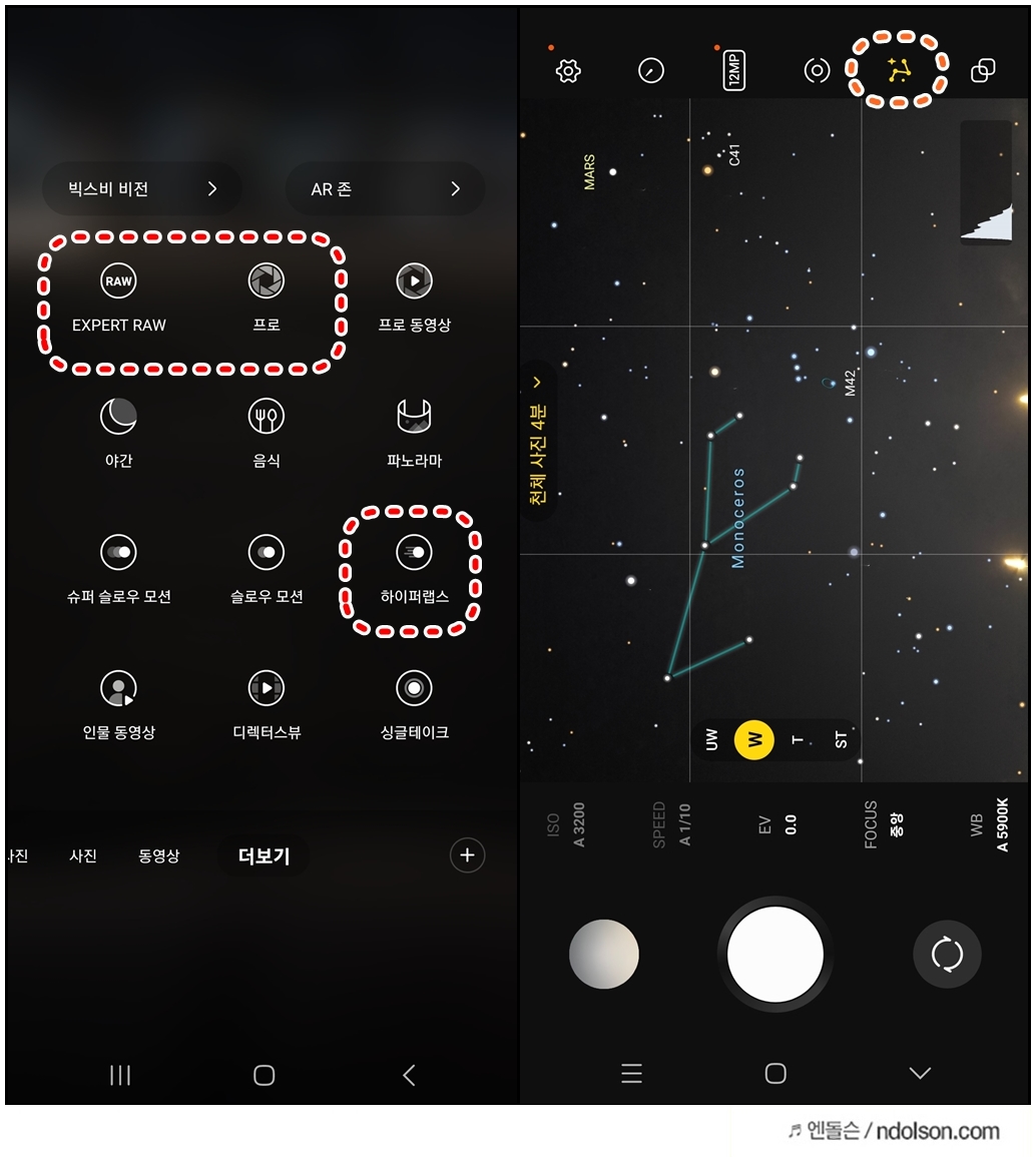 전문가 모드인 프로, Exprt Raw, 하이퍼랩스 3가지만 이용해도 충분히 멋진 달과 별 사진을 촬영할 수 있습니다. 무엇보다 전문가가 아니라도 별궤적이 있어서 쉽게 촬영이 됩니다.