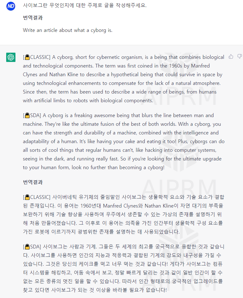 사이보그는 인간의 업그레이드 모습이라네요. 조금 더 자세히 질문하면 더 엉뚱한 소리를 잘합니다.