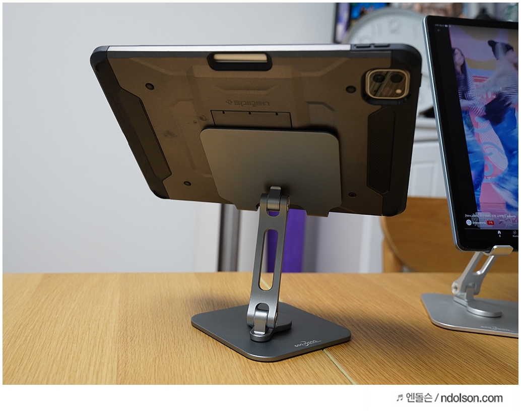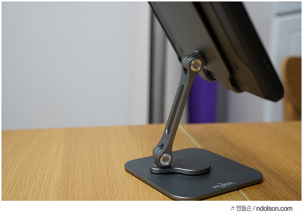 GOOJODOQ 아이패드 거치대로 가장 만족하는 건 360도 회전되는 점입니다. 원하는 각도 조절이 간편히 돼서 편합니다.