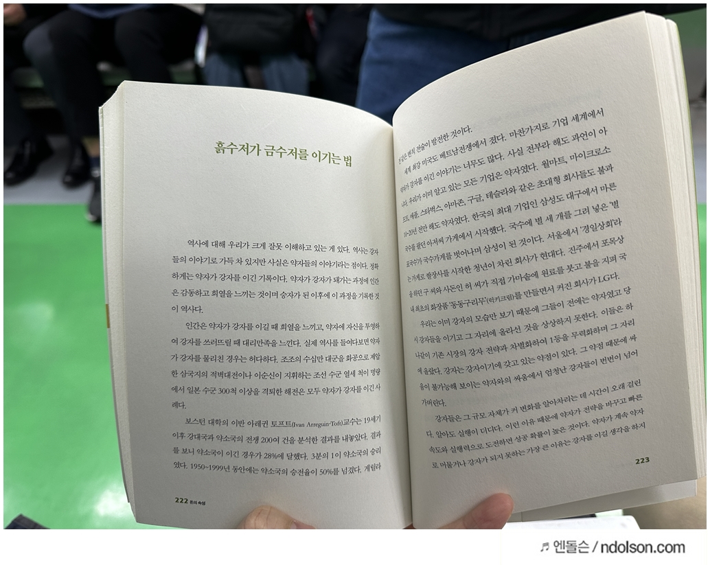 돈의 속성은 산전수전 다 겪은 어르신이 이야기하는 느낌이 들었습니다. 반대로 M&A 등은 전문지식이 많아 설명을 잘하시는 데, 자기계발 서적처럼 무언가 하세요! 이런 설명은 조금 아쉽게 느껴졌습니다.