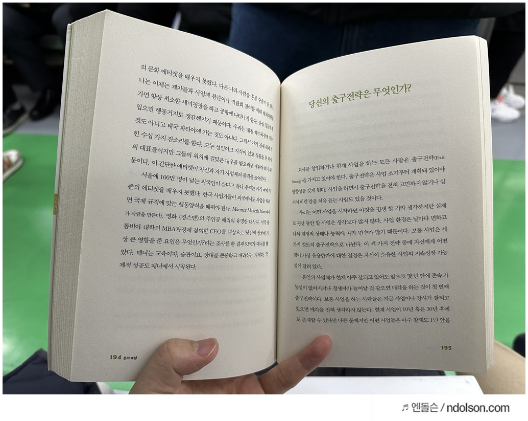 내가 직장인이든, 사업을 했건 출구전략이 있어야 했습니다. 확실히 책을 다 읽고 느낀 점은 돈의 속성에서 이야기하려는 건 큰길로 다녀 리스크를 줄여라! 작은 돈도 소중히 모으는 중요성! 그리고 마음이 바로 서야 사업을 잘할 수 있다는 생각이 듭니다.