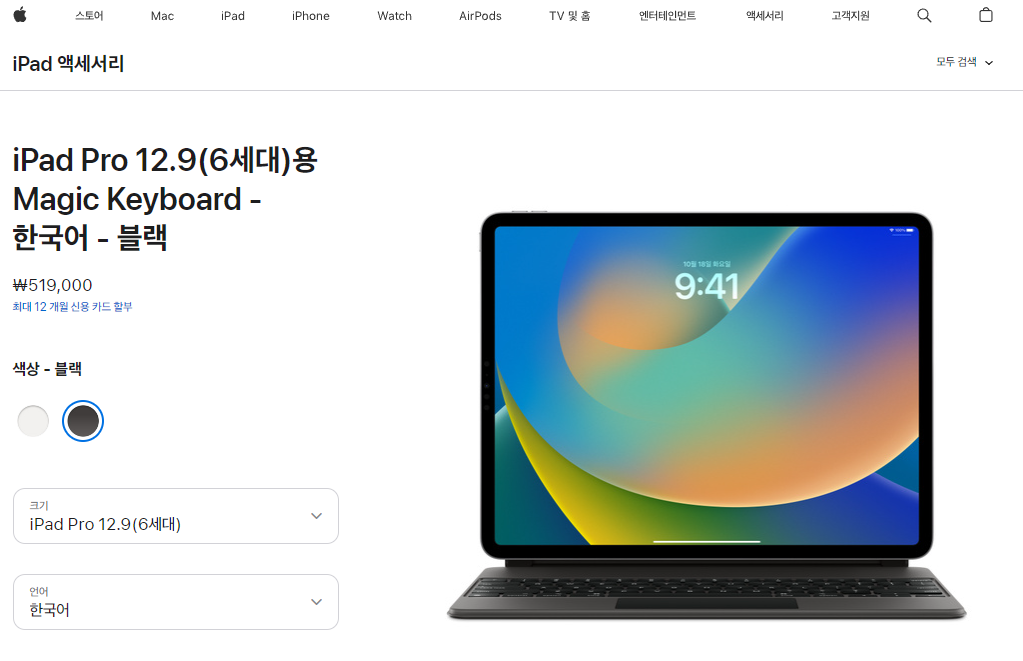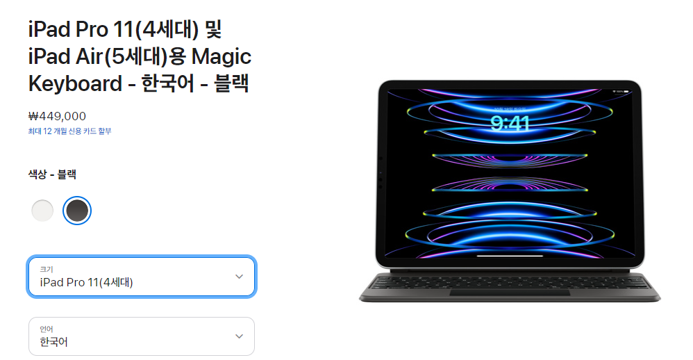 하지만 가격이 너무 비쌉니다. 아이패드 프로 11인치 3세대 128GB 와이파이 구매 110만원에 구매했다고 하더라도 블루투스 키보드와 거치대 가격이 40~50만원대라면 너무 가혹하네요.