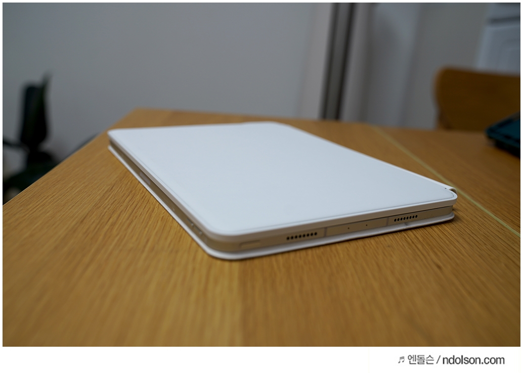 전체적인 디자인은 상당히 핏(딱 맞게) 되어 있습니다. 이건 애플 정품 아이패드 매직키보드도 동일합니다. 그래서 아쉬운 건 아이패드를 완전히 덮지 않아 옆에서 부딪히면 커버로의 역할은 조금 아쉬울 듯합니다.