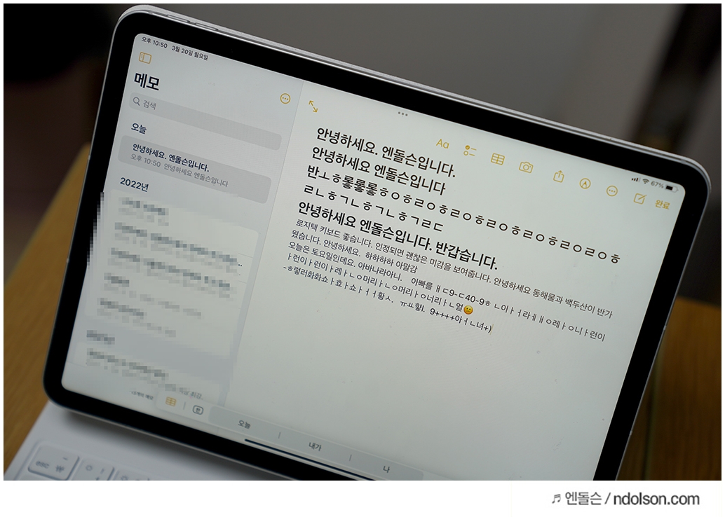 아이패드 키보드의 타건감은 생각보다 좋았습니다. 틱틱틱 소음정도가 나쁘지 않은 정도인데, 카페에서도 방해는 되지 않을 정도이며, 깊이 있게 타건 되는 감촉이 좋았습니다.