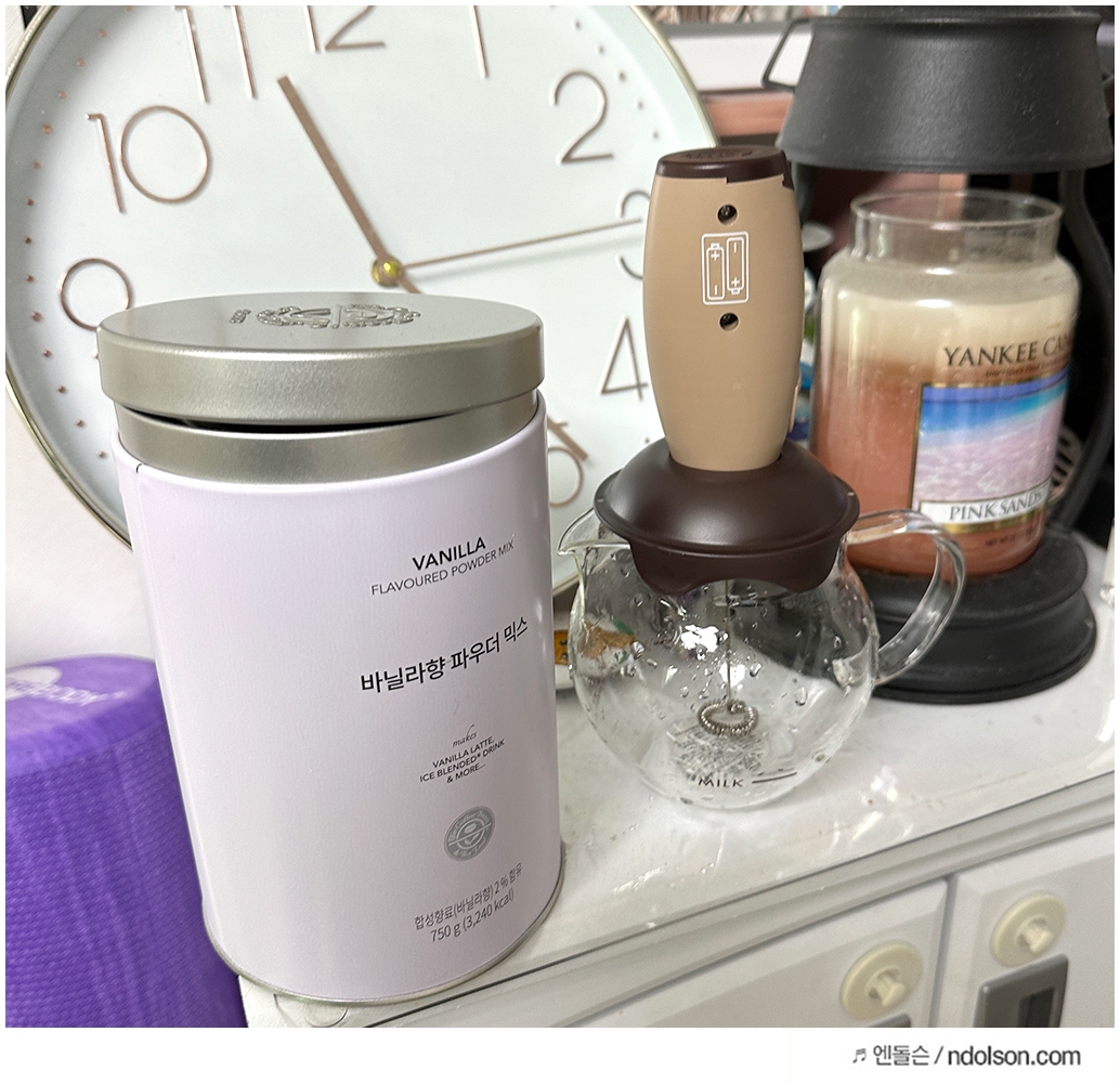 커피빈 바닐라 파우더를 2스푼을 우유와 함께 넣고 하리오 우유 거품기로 돌려서 거품을 만들어 줍니다.