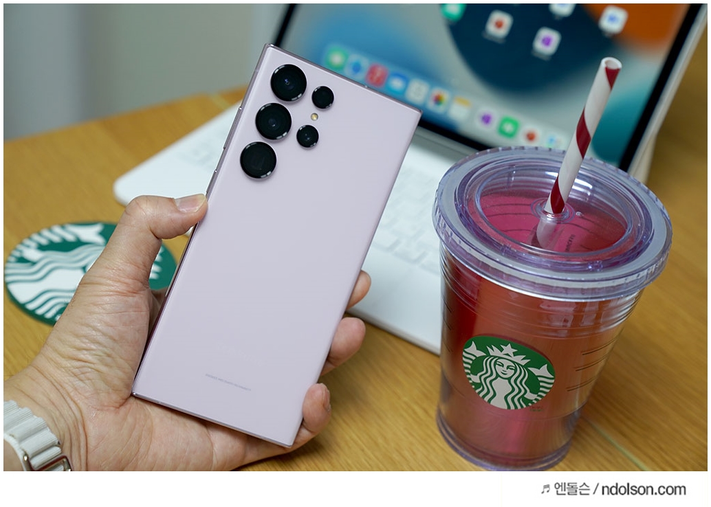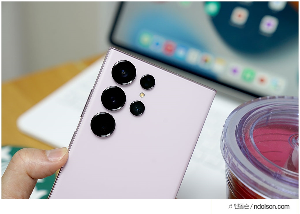 갤럭시 S23 울트라 라벤더 색상입니다. 카메라 렌즈만 도출되어 있고 색상도 라벤더로 보이시죠?